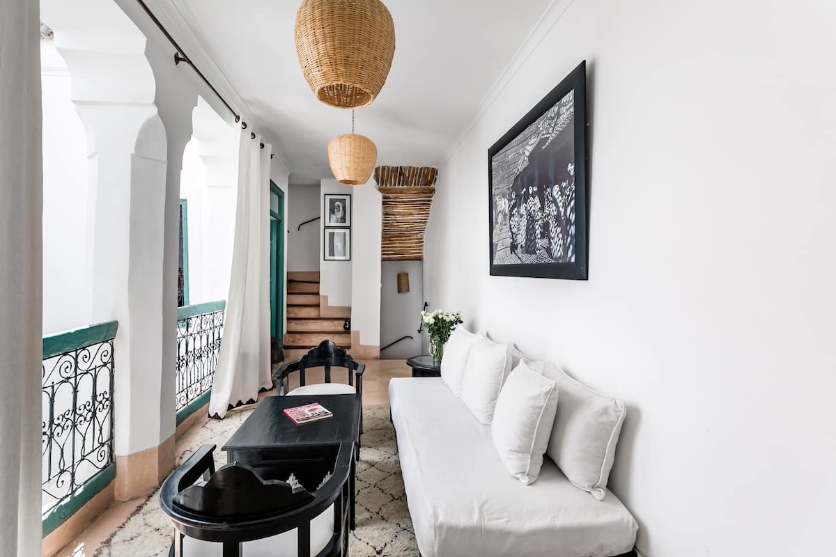Bienvenue dans notre Riad récemment rénové au coeur de Marrakech : Dar Nurah Le Riad est à louer dans son intégralité, aucun autre invité ne partagera avec vous. Que vous soyez un couple, une famille ou un groupe d'amis, Dar Nurah sera le refuge parfait pour vos vacances à Marrakech. Un total d'environ 180m² à louer en exclusivité avec 2 chambres en suite joliment décorées, un salon avec un canapé convertible en lit supplémentaire et de nombreux espaces de vie ouverts.