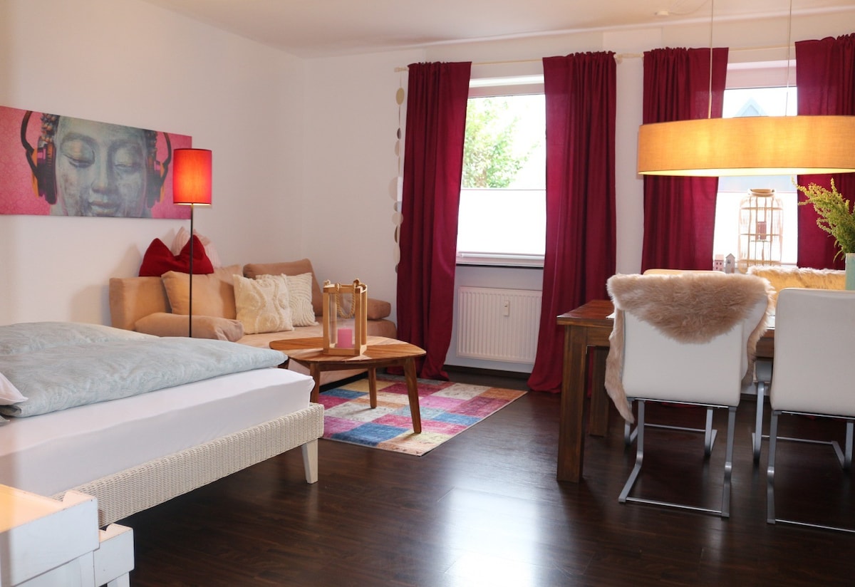 À 5 km d'Aschaffenburg, sur les contreforts du Spessart, je vous propose mon appartement moderne et ensoleillé de 2,5 pièces avec sa propre entrée. Il bénéficie du soleil du matin sur le toit-terrasse avec une vue lointaine et un balcon. Lit de 1,60 m, baignoire, TV, WiFi et kitchenette. Deux chats sympathiques vivent dans la maison. A 15 minutes de l'A3 et de l'A45, mais en pleine nature pour se détendre. Vous pourrez rejoindre une boutique ouverts 24h/24 et des restaurant à quelques pas.