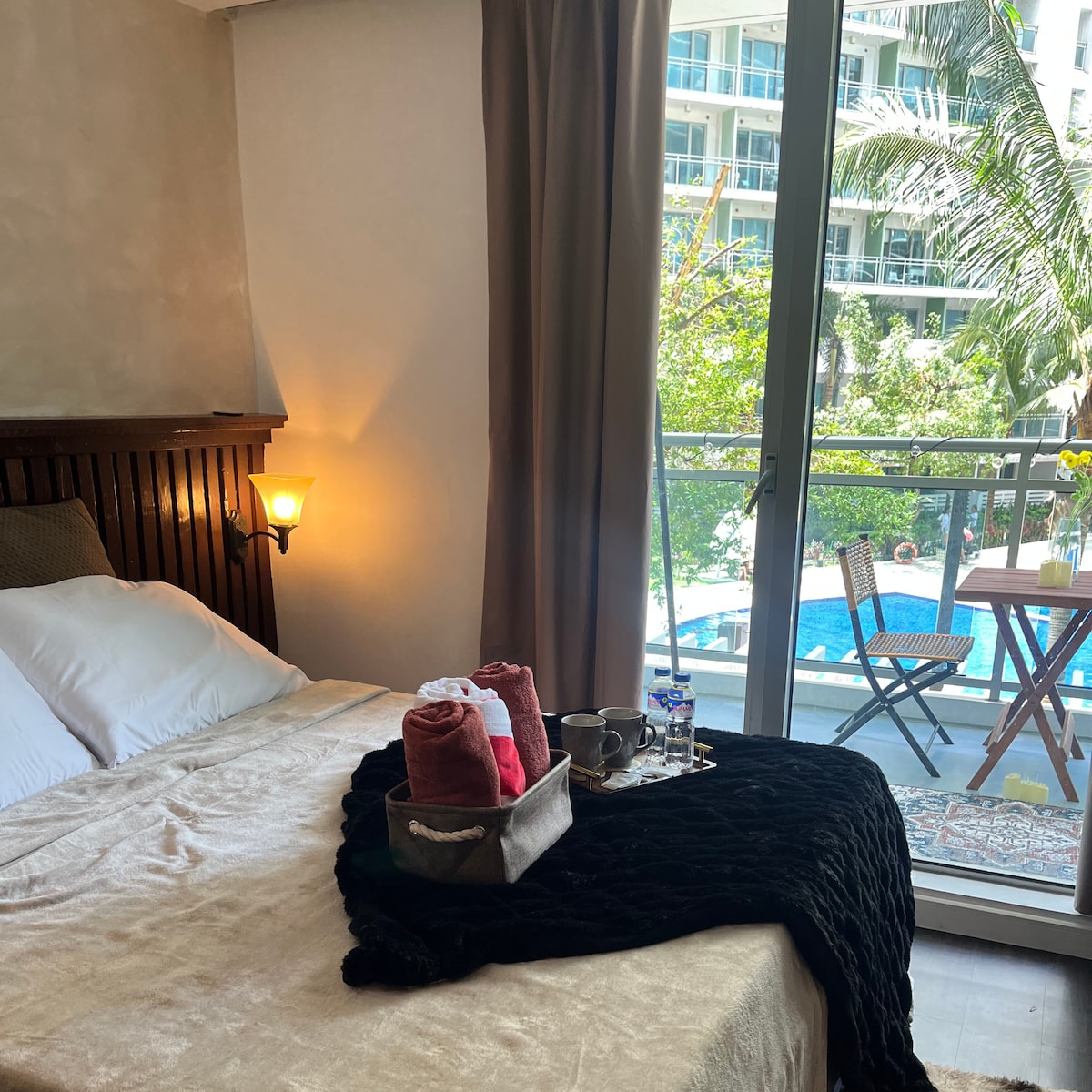 Condo in Parañaque: Cozy Fireplace & Pool view