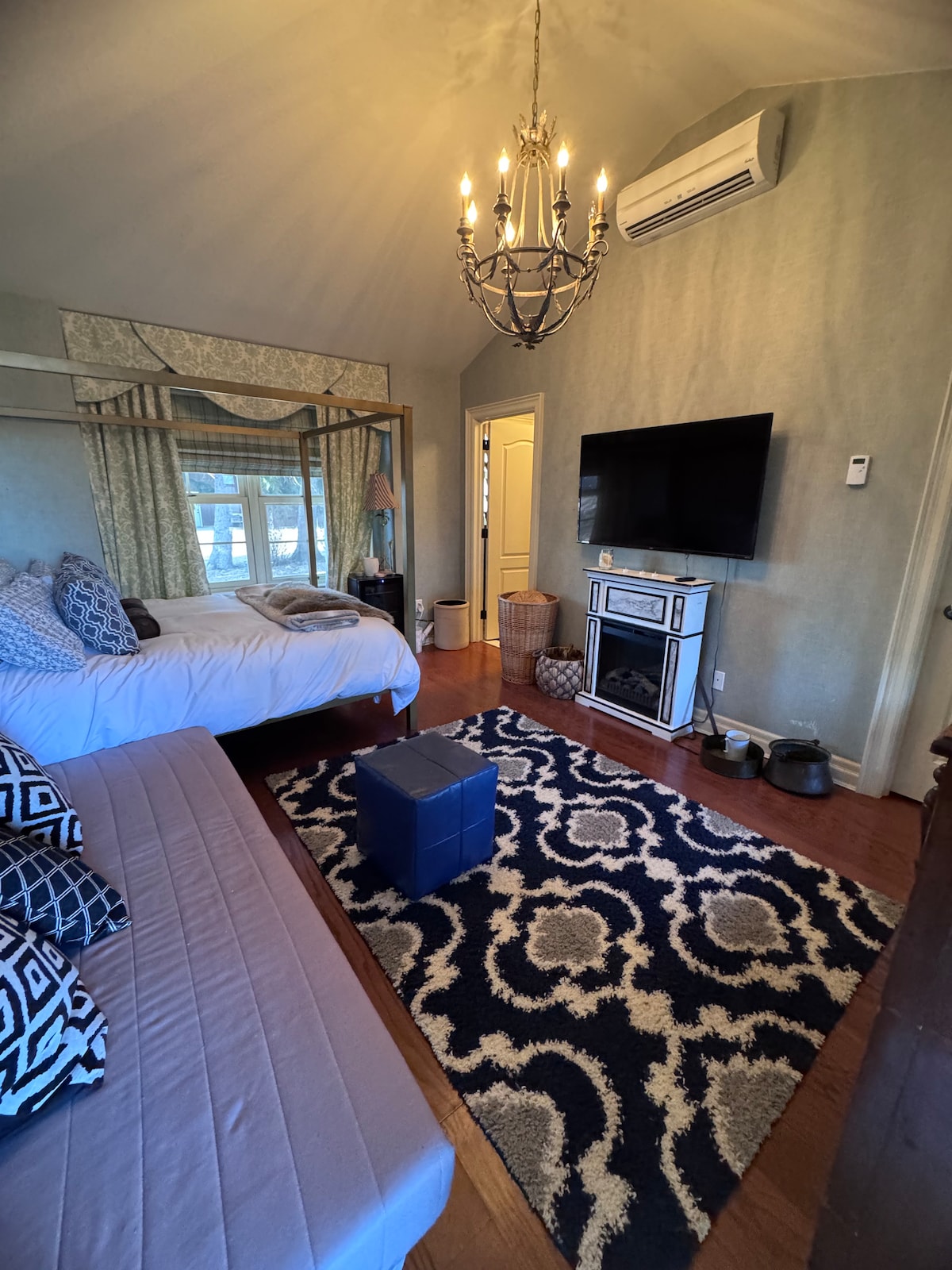 Bienvenue dans notre retraite de 73 acres ! Votre suite Loft privée dispose d'un lit queen size confortable. Des ajouts moins confortables pourront accueillir jusqu'à 7 personnes dans un grand espace. Il y a un balcon pour profiter du coucher de soleil. La vraie beauté vous attend à l'extérieur où vous pourrez visiter le sentier du parc de sculptures métalliques de 1 km, profiter des 5 km de sentiers, vous balancer sur notre balançoire de ravin, nourrir les canards et profiter de nombreux équipements partagés sur la propriété. Découvrez notre dortoir privé pour 4 personnes @ https://www.airbnb.com/slink/QllJwtXy