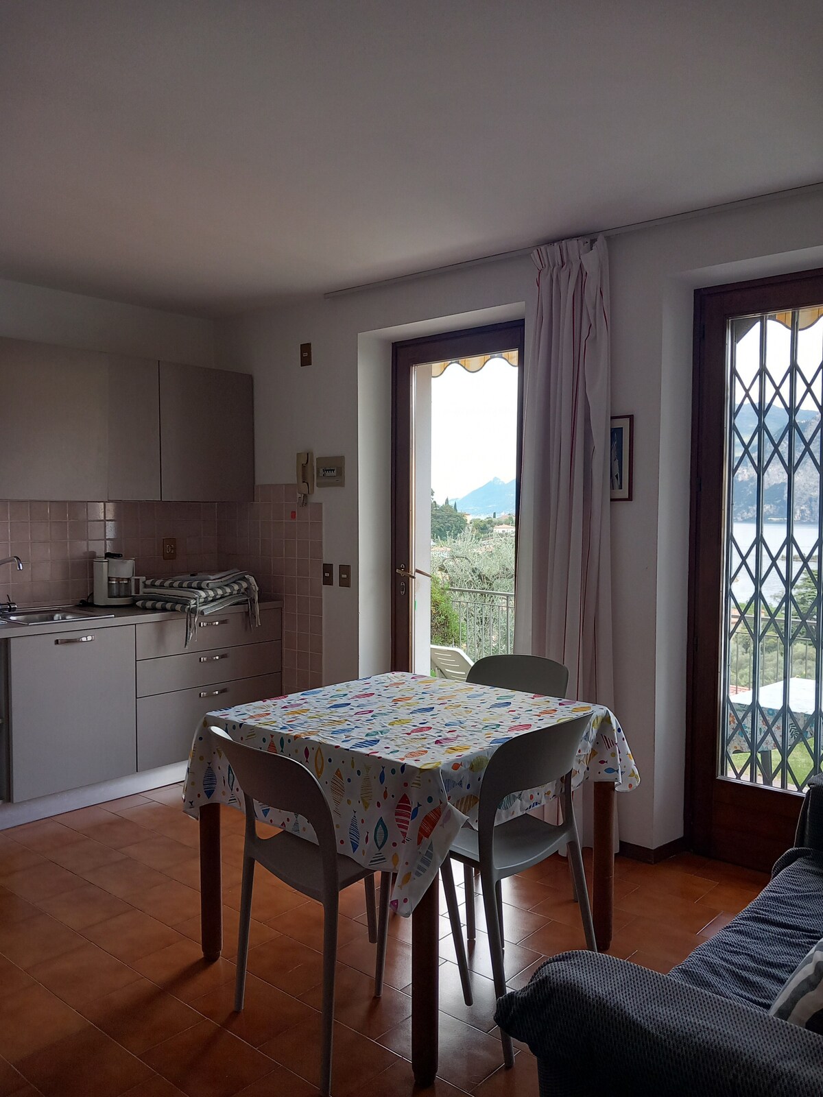 Appartement lumineux avec grande terrasse et vue magnifique sur le lac, composé de : - cuisine/salon équipée avec évier, four électrique, réfrigérateur et congélateur, micro-ondes, bouilloire, ustensiles, vaisselle, TV-SAT, Wi-Fi et canapé-lit. Sur la terrasse, il y a une table, des chaises et des transats - chambre avec lit double, grande armoire, tables de chevet et fenêtre avec vue sur le Mont Baldo. - salle de bain avec lavabo, wc, bidet, douche, sèche-cheveux, fenêtre avec vue sur le Mont Baldo.
