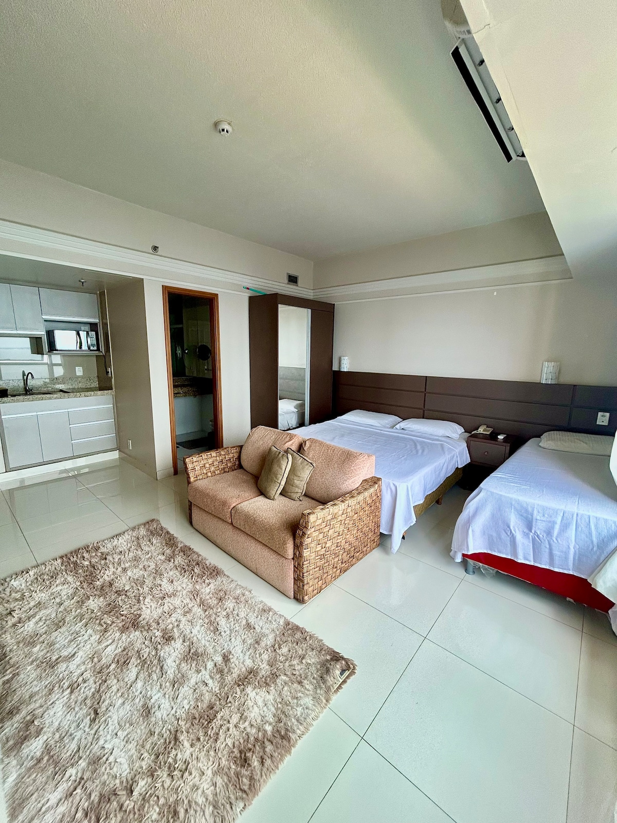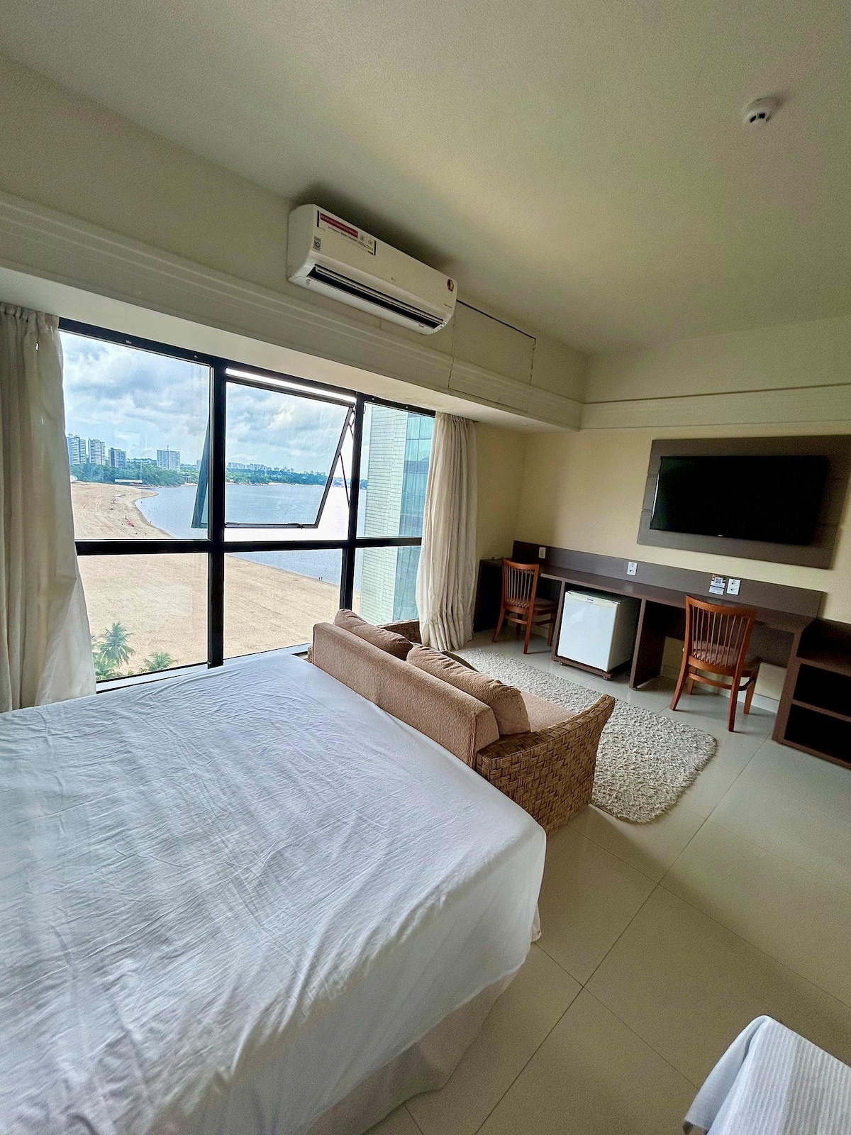 Grand appartement avec chambre 2 lits simples ou 1 lit double, salon, cuisine, balcon, meublé, avec table, canapé, 2 télévisions câblées, un dans le salon et un dans la chambre ; réfrigérateur, table de cuisson, 2 climatiseurs, chambre et salon ; Internet, nettoyage quotidien ; 1 place de parking. Réception ouverte 24h/24, restaurant/bar. Espace de loisirs complet avec piscine extérieure, centre de remise en forme, sauna, salle de jeux et une belle vue sur la ville et le pont Rio Negro. Excellent emplacement avec trois centres commerciaux à proximité.