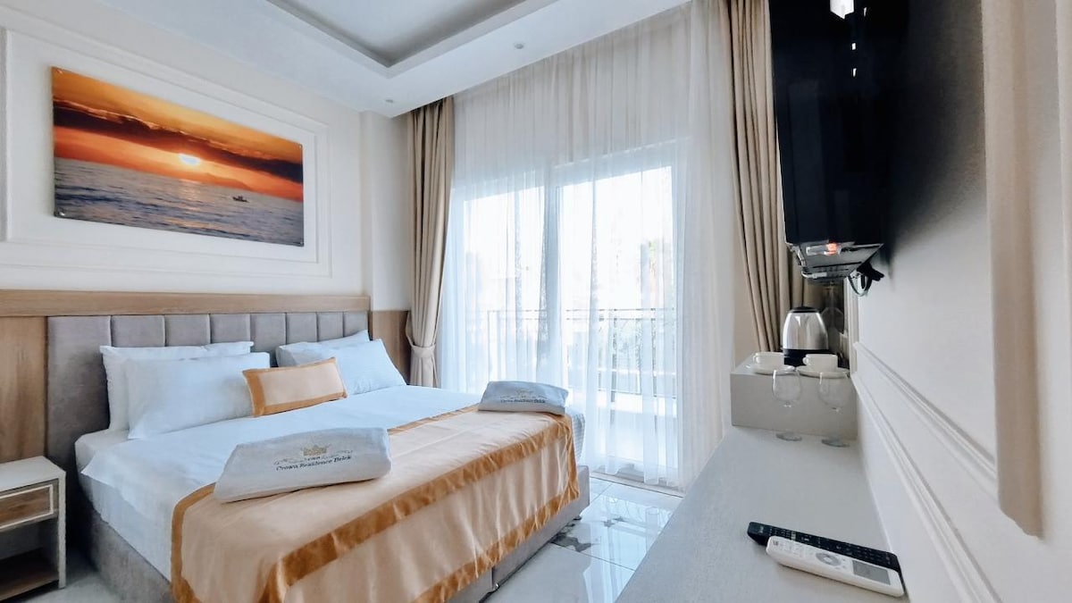 Vous allez adorer le décor élégant de ce charmant lieu de séjour. Notre emplacement est proche du centre de Belek, de la plage et de la terre de légende. Pour la saison hivernale, à partir du 5 octobre 2025, notre piscine sera fermée, et le prix comprend uniquement la chambre, sans petit déjeuner ni autres services. D'autres services peuvent être proposés moyennant des frais supplémentaires (café, thé, chaussons, etc.). Hôtel et spa CRB Crown