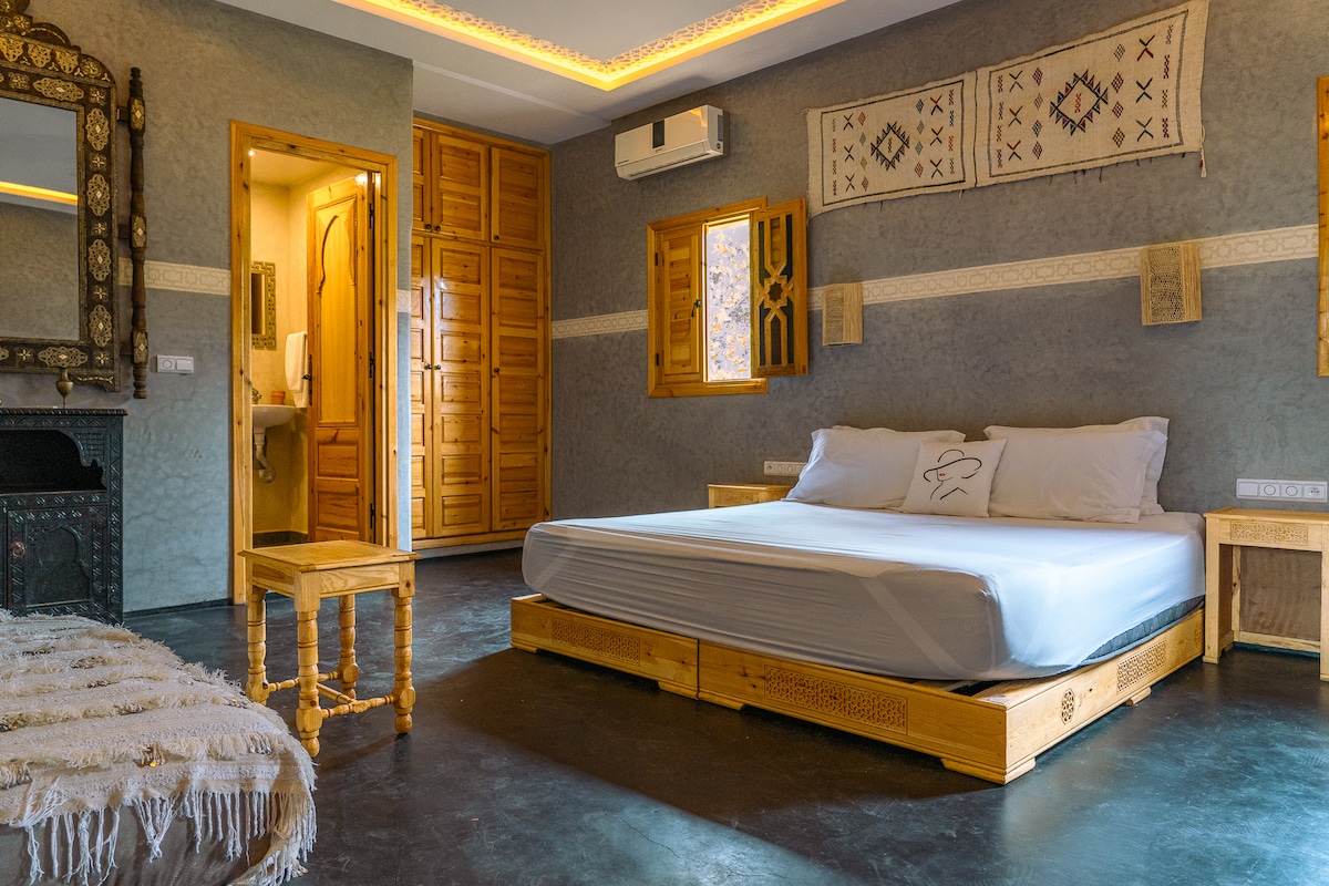 Évadez-vous dans ce paisible bungalow en argile et en bois niché dans une oliveraie à Ourika. Avec son artisanat traditionnel marocain, sa terrasse privée confortable et sa vue sur les jardins luxuriants, c'est le mélange parfait de charme rustique et de confort. Profitez de matins sereins au chant des oiseaux et détendez-vous sous un plafond en bambou tissé. Idéal pour les couples ou les voyageurs en solo qui cherchent à renouer avec la nature et à ralentir.À seulement 45 minutes de Marrakech, mais dans une atmosphère complètement différente.