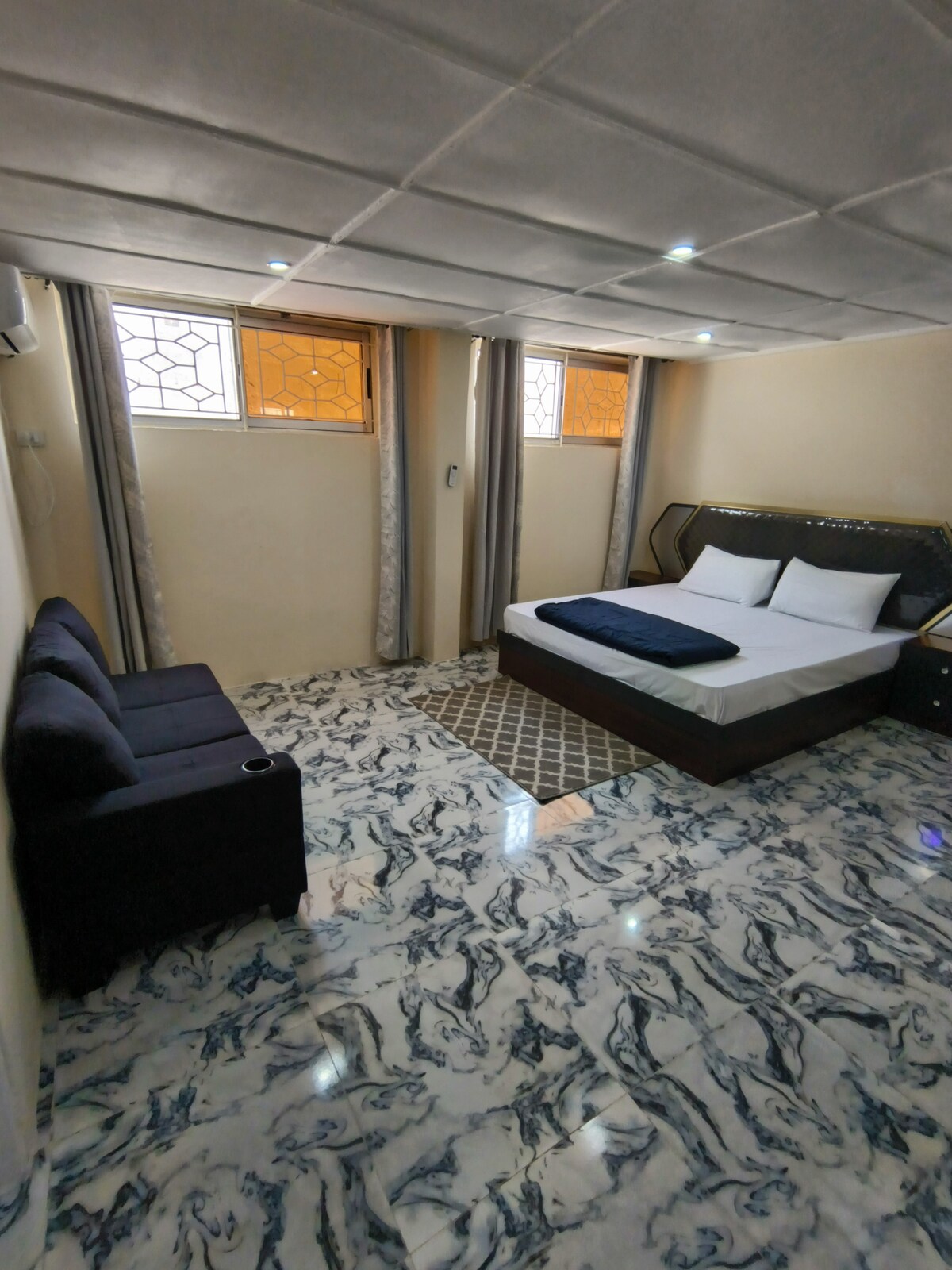 Enjoy extra space and privacy in our One-Bedroom Apartment at Tris Estates Hotel & Suites. This modern unit features a separate bedroom, comfortable bed, living area, private bathroom, air conditioning, smart TV, high-speed Wi-Fi, workspace, and daily housekeeping. Guests also have access to secure parking and our exclusive rooftop lounge. Perfect for business travelers, couples, and long stays seeking comfort, security, and a peaceful boutique hotel