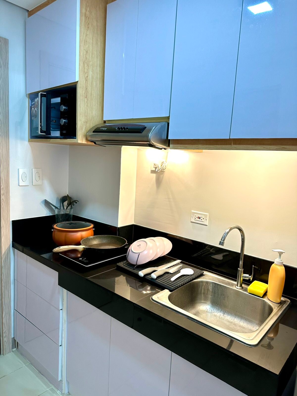 Un studio douillet et confortable situé au cœur de SMDC Cheer Residences à Marilao, Bulacan ! Notre unité est entièrement meublée et équipée avec tout ce dont vous avez besoin pour un séjour confortable et agréable, y compris un lit Queen Size confortable, un canapé-lit, une télévision à écran plat, une table à manger, une kitchenette avec un réfrigérateur, un micro-ondes, une bouilloire électrique et des ustensiles de cuisine de base, une salle de bain privée avec une douche chaude et froide, une piscine, une sécurité 24h/24 et un bureau de réception.