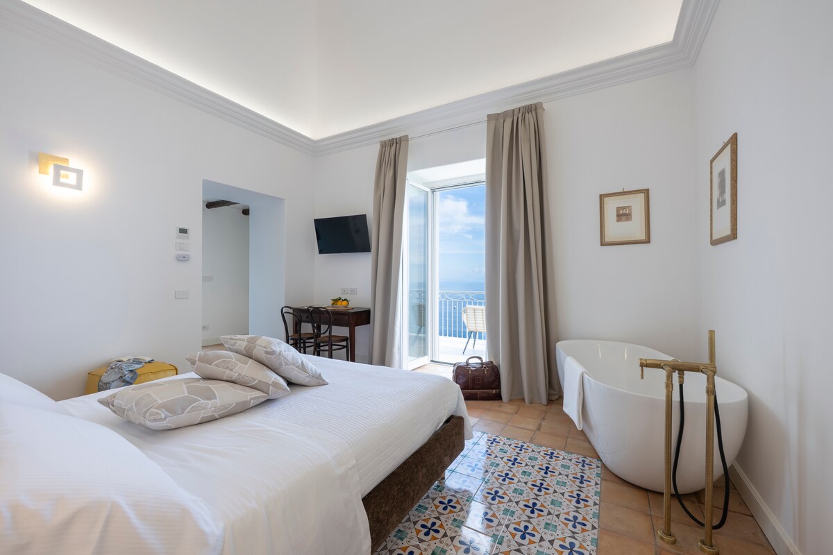 Chambre Fefe est un joli studio, divisé en un coin salon et un coin nuit. À l'entrée, vous serez accueillis par la cuisine équipée d'une table et de chaises et d'un canapé. Immédiatement après, vous trouverez la salle de bain avec douche et le coin nuit, avec lit double, bureau, canapé, armoire avec portes. Le balcon qui offre une vue magnifique sur le golfe de Salerne est équipé d'une table et de chaises. Le balcon est divisé par des cordes et des plantes pour la vie privée.