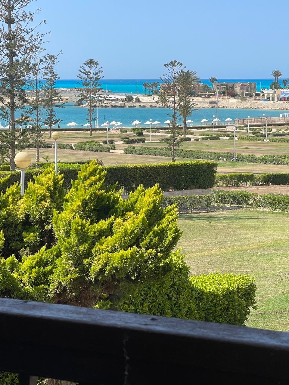 Chalet au rez-de-chaussée à Hacienda Bay 123 km Alexandria-Matrouh road, jardin privé avec barbecue, 1 chambre principale avec 1 grand lit, 1 chambre principale avec lit banquet pouvant accueillir 3 personnes et canapé-lit et 1 chambre d'hôtes avec deux lits de 120 cm, installation complexe, café et espace restaurant avec plus de 30 installations, salle de sport, SPA, piscine chauffée, piscine à débordement sur la plage, plage privée, installations de plage, accès facile au marché de Sidi Abdul Rahman