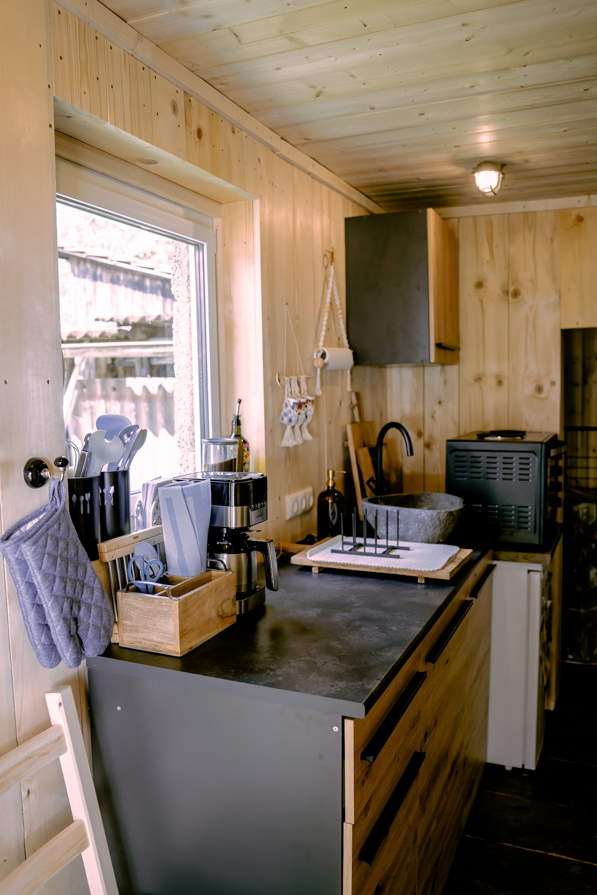 Profitez d'un séjour agréable dans un endroit calme pour faire de la randonnée, du vélo, travailler ou tout simplement vous détendre. L'appartement dispose de sa propre entrée et d'une terrasse. La cuisine ouverte entièrement équipée (four, micro-ondes, machine à café) offre de la place pour une famille ou un maximum de quatre personnes avec une grande table à manger et une possibilité de couchage supplémentaire. Le salon est aménagé comme une pièce de passage vers la douche et les toilettes avec un bureau et un canapé-lit supplémentaire.