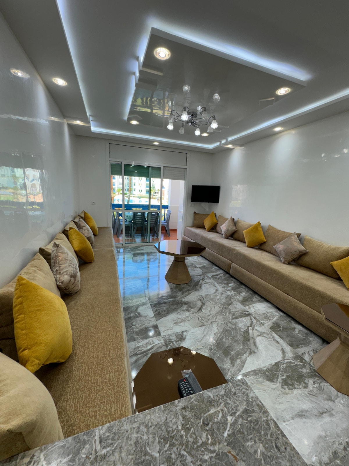 ✨L'appartement Panoramique à les jardins bleus se caractérise par son design à la fois moderne et élégant, chaque élément étant soigneusement conçu pour vous garantir une expérience sans pareille ✨Son emplacement central ✅ Appartement avec vue panoramique sur la mer et à proximité de : ✅ 1 min de la plage de Martil 🏖 et sa fameuses corniche ✅ 5 min de la Plage de Cabo Negro 🏝 ✅ 4 min de Ikea et KFC 🍗 ✅ 6 min de Marjane et McDonald's 🍟 ✅ 1 min restaurants cafés, commerces