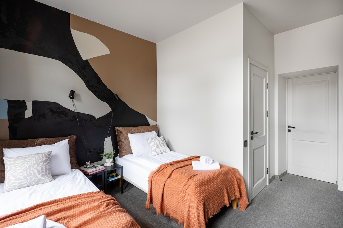 Emplacement imbattable : à quelques pas des transports🚎, des parcs 🌳 et du marché d'Agenskalns. 🍜 À 15-20 minutes en voiture de l'aéroport ✈️ et à 10 minutes du centre-ville. Séjournez dans un bâtiment en bois historique rénové avec un parking gratuit 🚗 juste devant la porte. Votre escapade parfaite à Riga vous attend ! 🏠