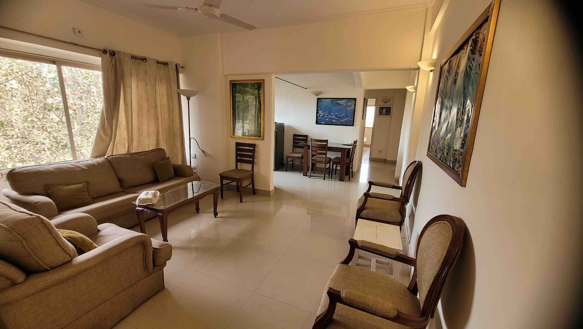 Profitez du confort à Marita Apartment et cadre 1-BHK au rez-de-chaussée près de Carter Road. À quelques pas de l'océan, il dispose d'un patio de jardin privé, d'un parking voiture/vélo, d'un lit queen size, d'un canapé-lit, d'une télévision connectée, d'une connexion Wi-Fi et d'une cuisine complète. Situé dans un quartier calme et sécurisé près du Rizvi College, il offre un excellent rapport qualité-prix avec un accès facile à la vie urbaine. À deux pas du Rizvi College, des promenades en bord de mer, des cafés et des magasins. Idéal pour le travail ou les loisirs avec tout le confort moderne inclus.