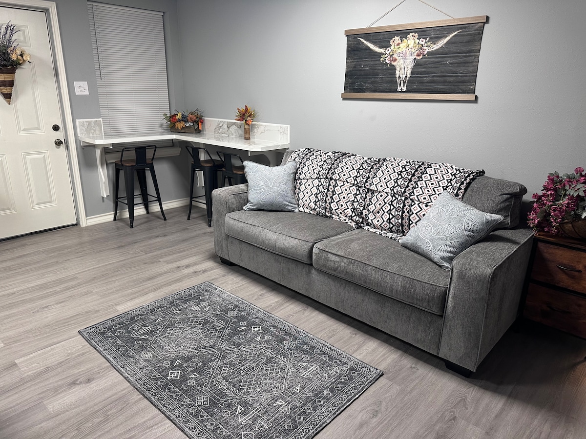 Entièrement rénové en 2025, cet élégant appartement de 2 chambres/1 salle de bain allie confort moderne et thème western texan. Situé au cœur du centre-ville de Brownsville, notre complexe privé sécurisé vous met à quelques pas des restaurants, des bars et des cafés. Marchez jusqu'aux lieux de vie nocturne ou détendez-vous dans un havre de paix sûr et calme après avoir exploré la ville. Parfait pour les voyageurs qui recherchent la commodité, le charme et le confort en un seul endroit.
