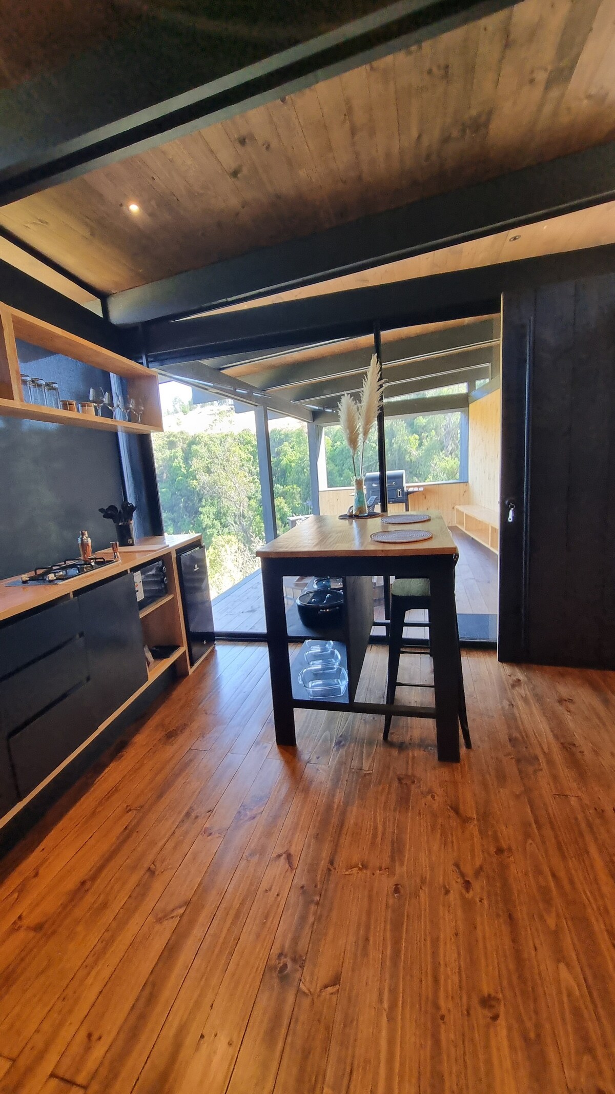 Refuge confortable d'une atmosphère (24 m2) de conception unique de type tiny house, inséré dans un ruisseau indigène avec une vue spectaculaire sur les vallées où vous pourrez voir une grande variété d'oiseaux. Idéal pour échapper à la ville et se réfugier du vent côtier. Grande terrasse avec baignoire extérieure chaude et douche d'eau froide. Très proche des plages de Matanza et Pupuya. (1 lit queen size + lit pour enfants) . 4x4 recommandé pour les jours de pluie - À 4,5 km de Matanzas - 3,5 km de La Vega - À 24 km de Puertecillo