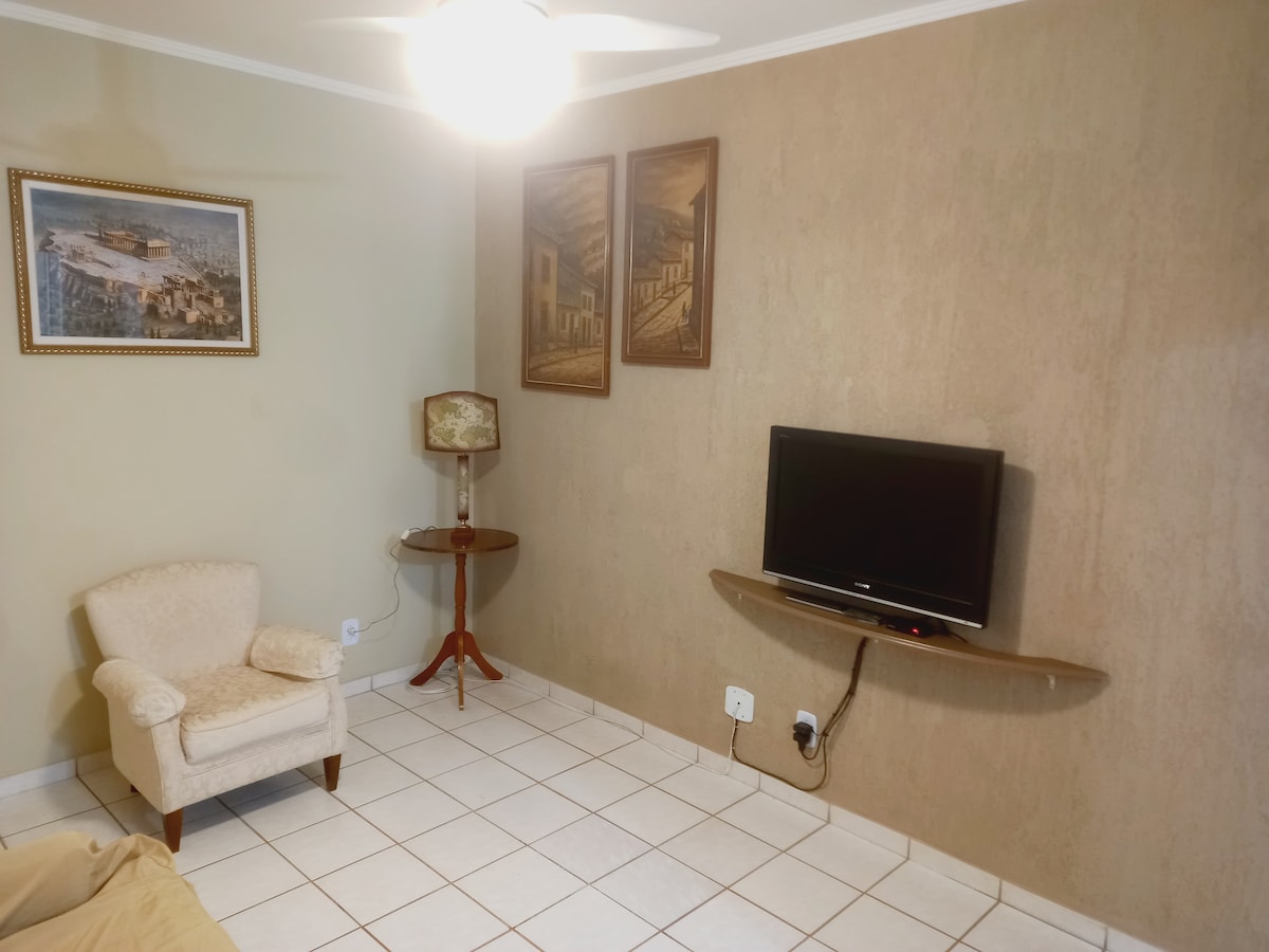 Appartement complet pour votre besoin de séjour avec confort, parking couvert pour la voiture, place arborée à vue des chambres, apê au premier étage, cuisine bien équipée, comptoir américain qui sert de table à manger, lave-linge, ventilateurs de plafond, équipements neufs fonctionnant parfaitement. La copropriété est à trois minutes du centre commercial Jaraguá et à huit minutes du centre d'Araraquara.