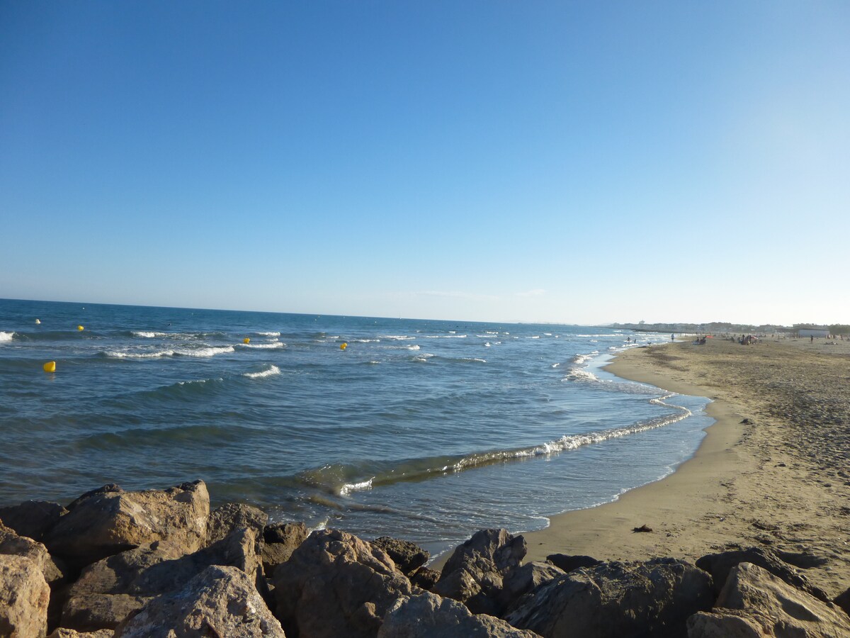 Carnon, idéalement situé entre Palavas et Grande.Motte,véritale havre de paix les pieds dans l'eau.2eme etg,Studio moderne et équipé de 26 m2, balcon 5 m2 où prendre les repas à 4 sous le son des vagues.Fonctionnel,2 lits cabines rabatables,canapé convertible de qualité. TV,lavevaisselle,4 plaques vitro,four.grill micro.ondes,ventilateur de qualité,SDB avec baignoire.Nombreux rangements. Accès privatif à la plage.Parking sécurisé.Couettes fournies pensez aux housses!