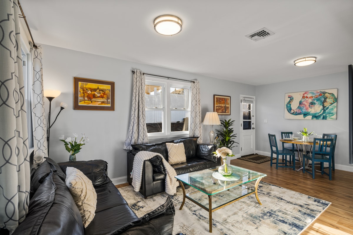 Ce studio privé confortable et élégant au sous-sol avec une entrée séparée se trouve à seulement 15 minutes de New York et à proximité des centres commerciaux populaires du New Jersey. Profitez d'une connexion Wi-Fi gratuite, du chauffage central et de la climatisation, et d'une télévision intelligente avec Netflix gratuit. Un grand lit, un canapé-lit et une salle de bain moderne assurent le confort, tandis que la kitchenette entièrement équipée facilite les repas avec beaucoup d'espace à manger. Situé dans un quartier calme et sûr, c'est le point de départ idéal pour les aventures en ville et les excursions shopping ! PARFAITEMENT PAS DE FÊTES