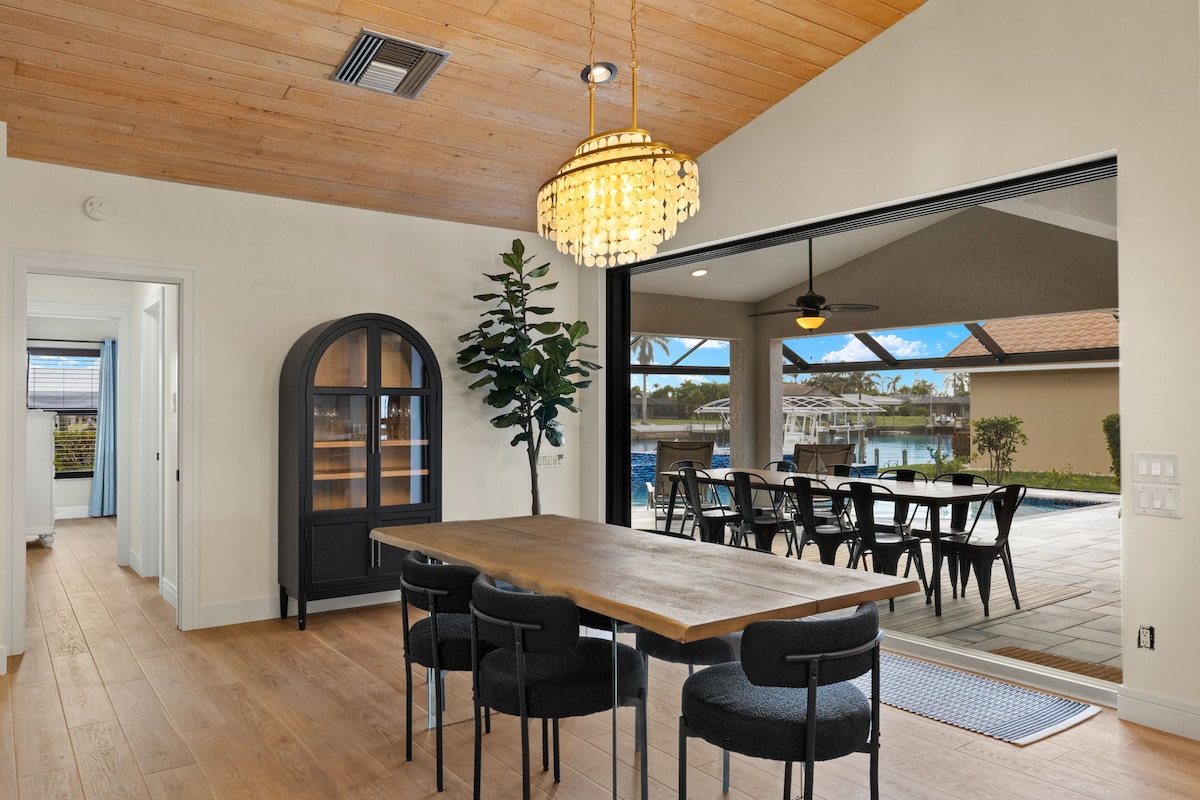 -All you need private retreat, 1 mile to downtown Cape Coral, 20 min to downtown Fort Myers & 25 min to Sanibel -Canalfront with heated pool & infinity-edge spa -Steam shower & spa-style toilets for a touch of pampering -Putting green & kayaks for outdoor family fun -Jet ski lift & 55’ boat dock—bring your water toys! -4 bikes for exploring the neighborhood -Garage gym -Tiki hut & outdoor lounge for family hangouts -Game room with pool table, shuffleboard, piano & karaoke—endless entertainment!