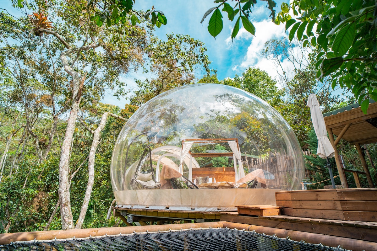Hermoso Domo - Glamping ubicado junto a reserva natural. INCLUYE: Cama King• Cocina equipada• Baño privado• Agua Caliente• Jacuzzi privado• Sofá y escritorio• Deck con mobiliario• Televisión• WiFi 300 MBP• Fogata autoservicio• Asador-BBQ a gas• Parqueadero gratis. COMIDA PARA PREPARAR O DE RESTAURANTE, LICOR, MEDICINA Y CASI CUALUQIER COSA SE PUEDE PEDIR A DOMICILIO Y LO LLEVAN HASTA LA PUERTA DEL GLAMPING. RNT: 162437