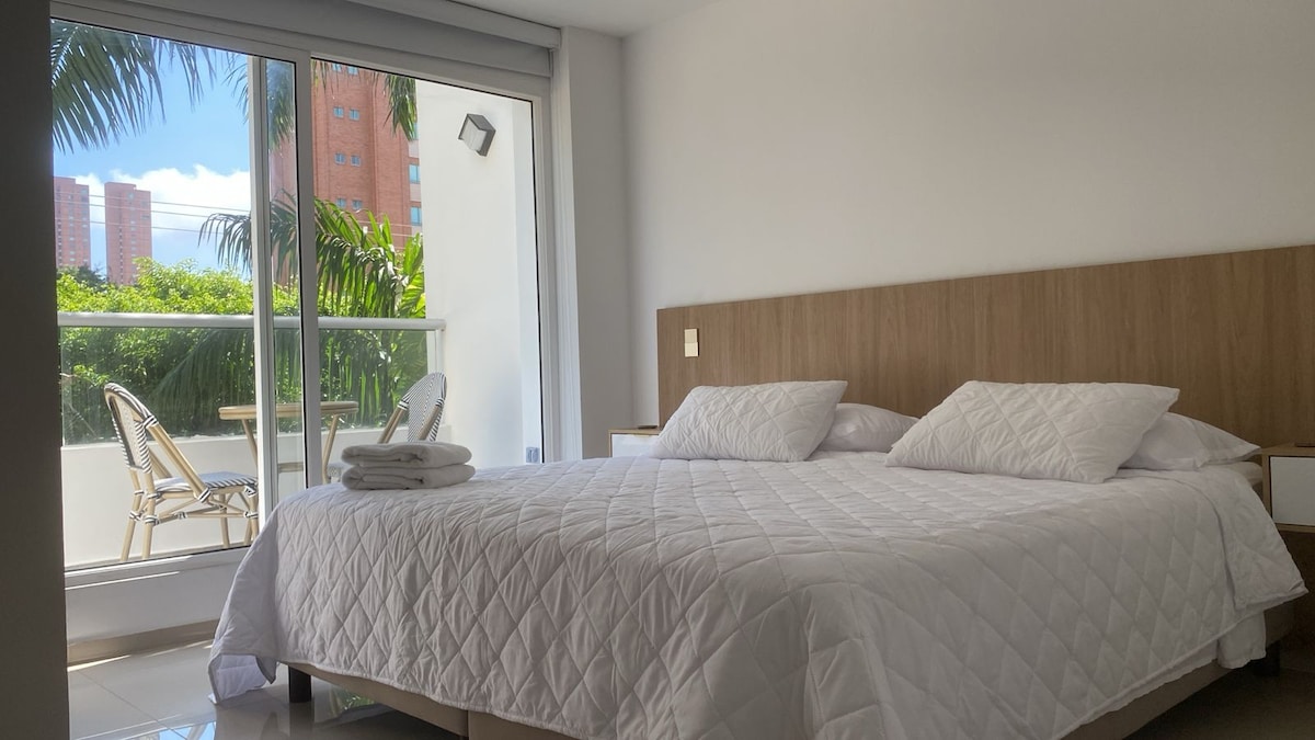 Confortable et bel appartement avec 2 chambres, chacune avec dressing, salle de bain privée et AA. Chambre principale avec lit double gigogne (un autre lit double en dessous) et chambre secondaire avec 2 lits simples gigognes (2 autres lits simples en dessous). Cuisine entièrement équipée. Salon et studio avec AA. Wifi haute vitesse et signal câble. 3 Smart TV. Immeuble avec piscine et salle de sport. Zone sécurisée. Notez que vous devez envoyer vos documents avant l'enregistrement (lois colombiennes).