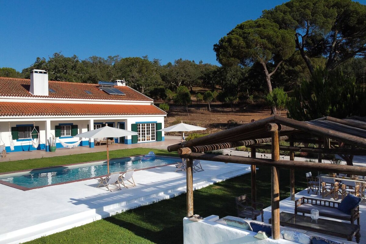 Évadez-vous dans une luxueuse maison de vacances à Alentejo, au Portugal, dans un domaine de 15 hectares entouré de liège et de pins parasols. Cette maison traditionnelle de style Alentejo, aux couleurs bleues et blanches emblématiques, offre tranquillité et charme. Réveillez-vous aux sons doux de la nature et aux cloches lointaines des églises. À 15 minutes à pied de la charmante ville de Melides, c'est la retraite parfaite pour la détente, l'intimité et des moments inoubliables dans un cadre serein.