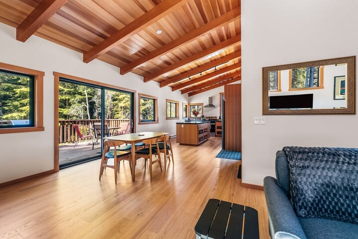 Nestled in the woods just 1 mile from historic Mendocino, this charming cottage offers a peaceful retreat with a fenced yard. The main living space includes a cozy queen-size bed, a cozy sleeping loft with a twin bed, a comfortable couch, and a fold-down breakfast bar with stools. The space includes a 57” smart TV, internet, a well-equipped kitchen, a bathroom with a walk-in shower and on-demand hot water, and a BBQ. Close to hiking trails and the beach.