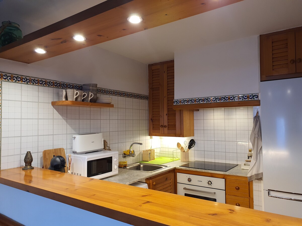 Appartement avec vue sur la mer, équipé de la climatisation, dispose de deux chambres, d'une salle de bains complète, une cuisine insulaire entièrement équipée et rénovée ouverte sur le salon, dans un espace très lumineux, avec une terrasse avec une vue impressionnante sur la mer et la plage. Il dispose d'un espace extérieur pour se détendre avec un canapé pour profiter de la vue et de l'atmosphère.
