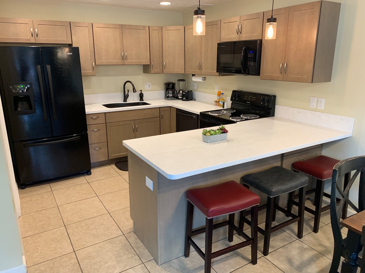Rez-de-chaussée confortable 2 chambres 1 lit King/1 lit Queen 1 canapé-lit Queen Size 2 salles de bain complètes Cuisine bien équipée buanderie de taille normale dans l'appartement Wi-Fi gratuit Téléviseurs 4K intelligents dans le séjour et les chambres Télévision par câble fournie par le syndic de copropriété Alexa est dans la maison ! Elle peut vous dire la météo, jouer vos chansons préférées ou même partager une blague !