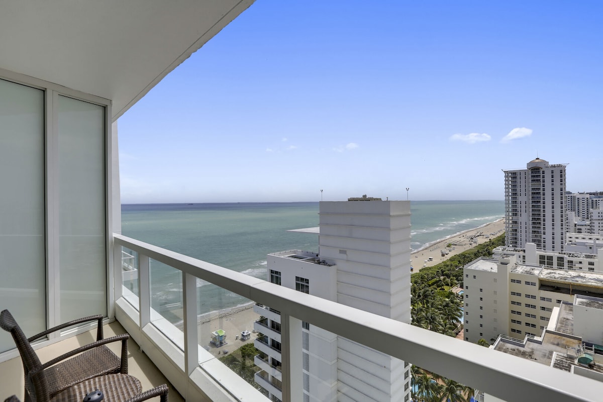 Bienvenue à Pure Miami Beach ! Évadez-vous dans ce studio moderne en bord de mer dans la ville ensoleillée de Miami Beach, en Floride, avec une vue imprenable à 180° sur l'océan. Détendez-vous dans un lit king-size somptueux, diffusez sur un téléviseur Samsung 4K de 65 pouces ou travaillez avec des connexions Wi-Fi et Ethernet privées de 300 Mo/s. Restez en forme dans la salle de sport rénovée, puis détendez-vous au bord de la piscine étincelante avec accès direct à la plage, chaises longues et un bar tiki pour des boissons et des collations tropicales. Un parking gratuit, des finitions de luxe et une ambiance océanique sans fin en font l'escapade ultime !