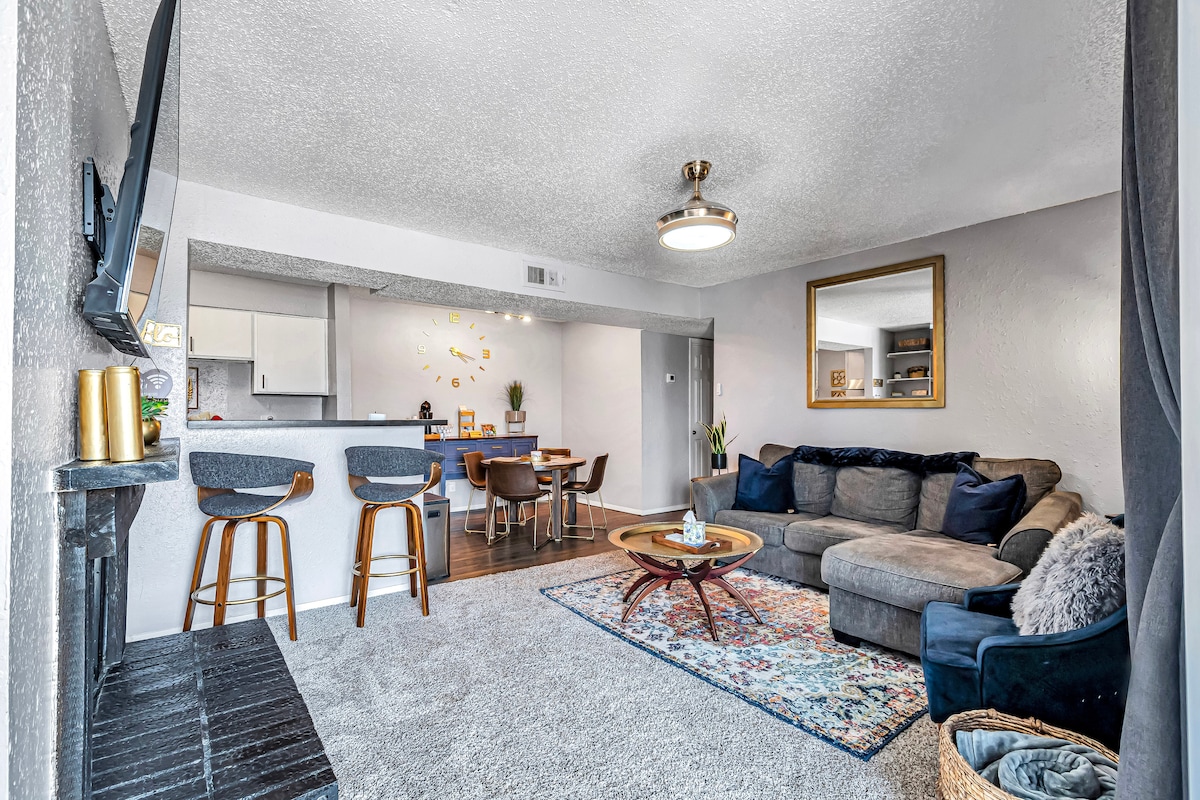 Condo de 1 600 pieds carrés🤯, 2 lits et 2 salles de bain avec passerelle💡 et patio éclairés par des cordes ! Famille et animaux de compagnie 🐕 ! Chaque chambre avec télévision connectée ! Profitez de 6 lits queen size, baby-foot, Nintendo et jeux de société. Cuisine entièrement équipée🧑🍳. Intérieur en briques 🏠-> tellement cool 😎 avec un espace de bureau dédié📝. Idéalement situé, il offre un accès rapide au centre-ville et à l'hôpital. Profitez du confort et de la commodité ! Réserver maintenant ! 🏃♂️