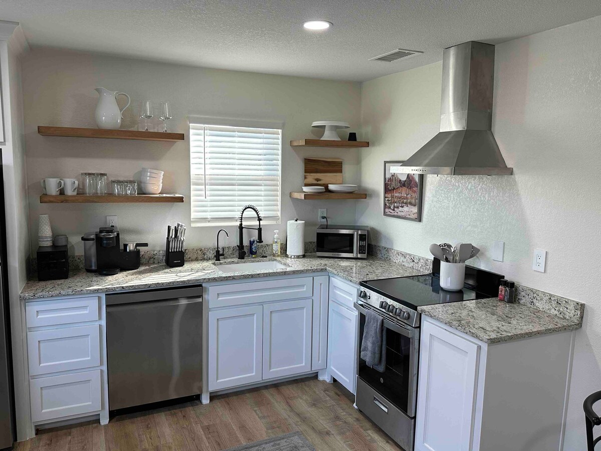 Escape to your private retreat with Mini Golf & a Fire Pit. Newly remodeled; modern design offering total privacy and luxury comfort. Perfect for couples or business travelers, it offers Fast Wi-Fi and serene setting with thoughtful touches to elevate every moment of your stay. • Blackout curtains for cozy nights • Private Entrance and 8ft Fenced Yard • Smokeless Fire Pit & BBQ w/ Outdoor Dining Table • Fully equipped kitchen & Nespresso