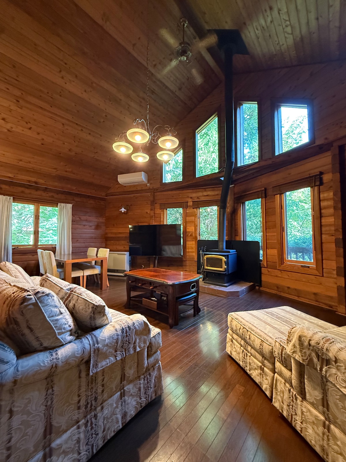 一棟貸し/薪ストーブの本格ログハウス/BBQ/65インチTV/高速WiFi/定員8名