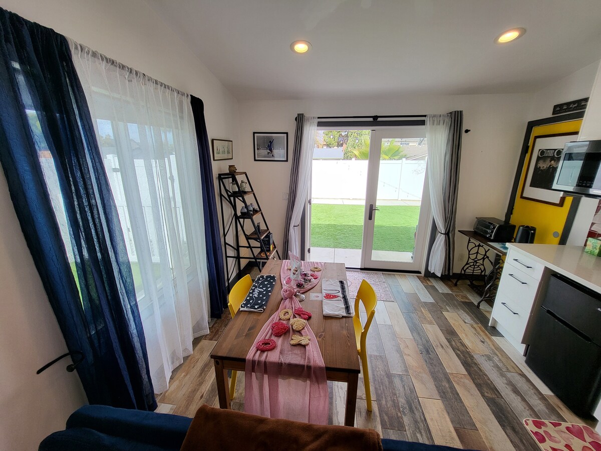 Bienvenue dans notre confortable maison d'hôtes San Diego Mira Mesa ! Cette suite privée de 600 pieds carrés offre confort et commodité pour les familles, les amis et les animaux de compagnie. Profitez d'un tout nouveau canapé-lit ajouté le 13 septembre 2025. Pour ceux qui travaillent pendant leur séjour, la suite comprend un espace de travail dédié à distance avec une connexion Wi-Fi rapide et une lumière naturelle, idéal pour les appels vidéo ou la productivité en déplacement. Avec un accès rapide à l'autoroute 15, vous n'êtes qu'à 15-20 minutes des plages, du centre-ville et des principales attractions de San Diego.
