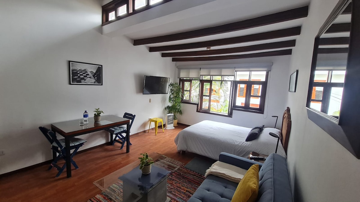 Confortable, éclairé et confortable mini loft situé dans une cinquième traditionnelle dans le quartier le plus central de Miraflores. Situé au deuxième étage (escaliers), à deux pâtés de maisons et demi du quai et du Larcomar. Elle dispose d'un lit queen size, d'un canapé (futon) à 2 places, d'un placard, d'une petite kitchenette et d'une grande fenêtre donnant sur les jardins de la quinta.