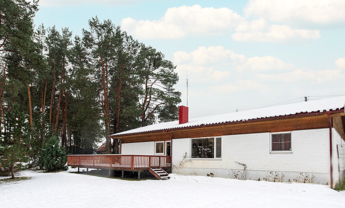 Située à 45 km de Vilnius, nichée entre deux lacs, une maison de 5 pièces (4 chambres avec vue sur le lac, 3 salles de bains) est disponible à la location. Les voyageurs ont accès à un sauna, un jacuzzi, un baby-foot et un tennis, un beach-volley, un barbecue à gaz, un belvédère au bord du lac, une barque à rames, etc. Nous accueillons les voyageurs à la recherche d'une retraite tranquille en pleine nature et ceux désireux de s'engager activement dans les loisirs. Le terrain du domaine est clos et, dans une autre maison du domaine, les hôtes, qui ont des animaux de compagnie, résident en permanence.