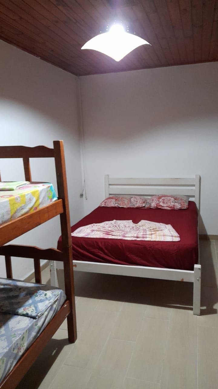 chambre d'une nouvelle auberge pouvant accueillir jusqu'à 4 personnes dans un lit double et un lit simple auxiliaire l'auberge est à 200 mètres de la magnifique plage de Guaiuba el Guaruja o.quarto dispose d'une salle de bains privative et vous pouvez utiliser la cuisine de l'espace commun nous avons un grand patio relaxant avec des filets et en pleine nature avec des singes oiseaux entre autres l'auberge fait face à une forêt dense de très verdoyant et de com.varios animas sauvages profitez de passer des jours à relajar
