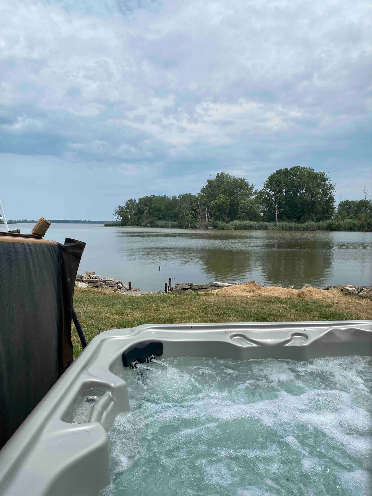 Chalet confortable de deux chambres, climatisation disponible, clôturé. La chambre principale dispose de portes françaises et de portes et fenêtres patio donnant sur le magnifique lac Érié. Faites des grillades tout en vous relaxant sur le porche avant sur la balançoire ou dans la cour près du foyer, sous des parasols ou dans le jacuzzi. Table à parasol sur la terrasse, foyer et chaises sur le quai où vous pouvez regarder les bateaux et les cargos monter et descendre de Detroit. Des jeux intérieurs et extérieurs sont également fournis pour votre plaisir.