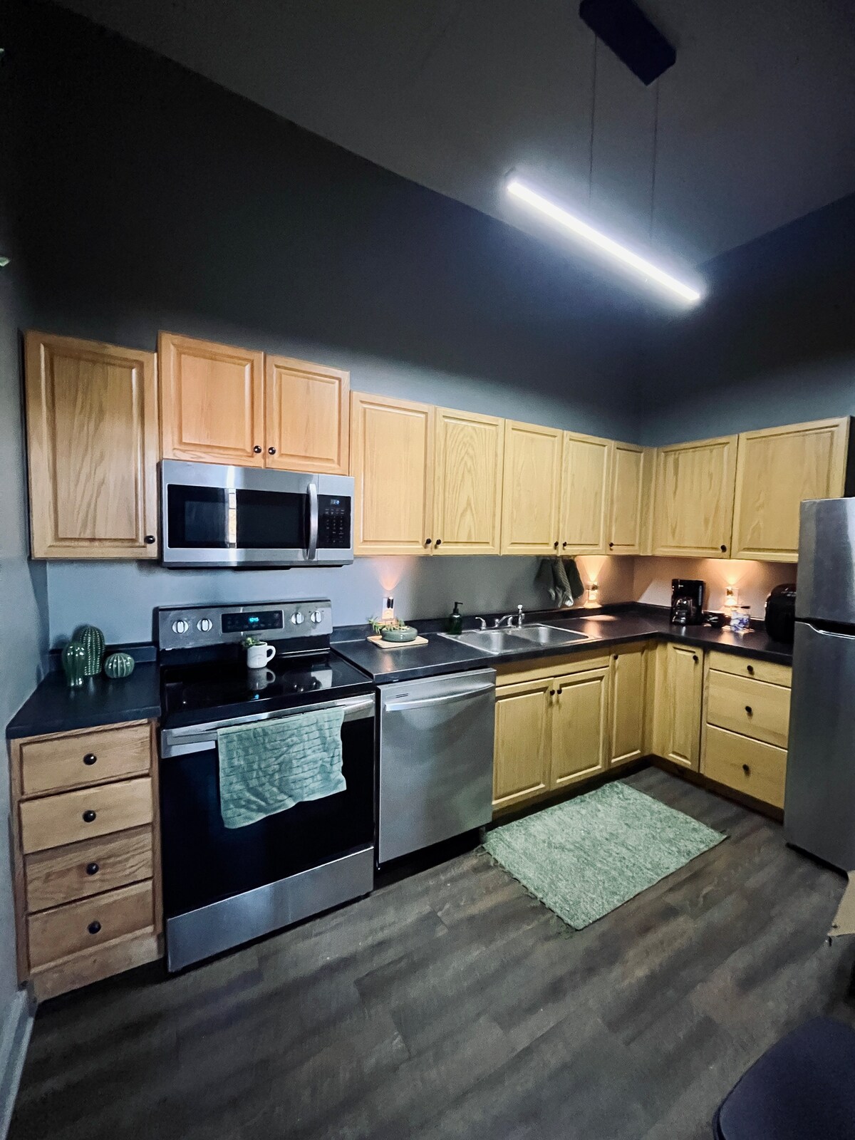 Bienvenue dans la paisible petite ville. Bungalow de deux chambres dans une rue calme. Récemment rénové. Entièrement meublé. Planchers en bois dur d'origine, nouvelle salle de bain carrelée, chambre principale avec lit king size, deuxième chambre avec lit de jour/lit gigogne, canapé-lit queen size dans le salon. Grande cuisine de campagne approvisionnée en œufs frais sans OGM et en café torréfié localement. Bureau avec imprimante. Roku TV dans le salon. Internet Wi-Fi. Parking garage. Cour spacieuse avec balançoire en pneu. Véranda ensoleillée. Animaux acceptés. Propre, confortable, prêt à être votre maison loin de chez vous.