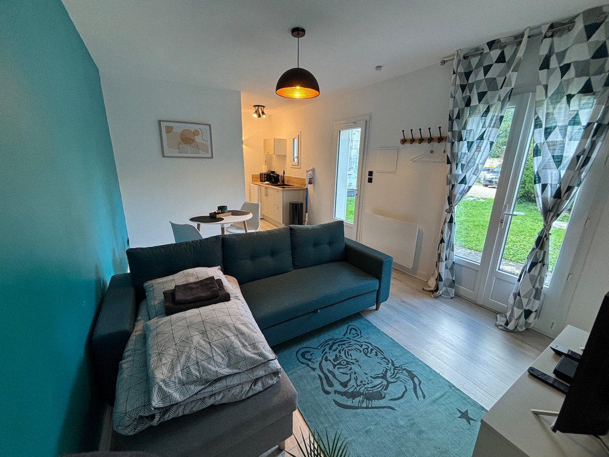 Charmant studio lumineux situé au 1er étage sans ascenseur. Studio de 22m2 tout confort, composé d une pièce de vie avec un canapé-lit, télé, box (wifi), une table pliante avec deux chaises et un placard de rangement. Une cuisine, comprenant une plaque de cuisson , frigidaire, four micro-onde, cafetière nespresso. Une salle de bain avec baignoire , wc, évier et miroir. Parking proche. Proche de toutes commodités. Possibilité de laisser vos vélos à l’intérieur de l’immeuble, cour commune privée