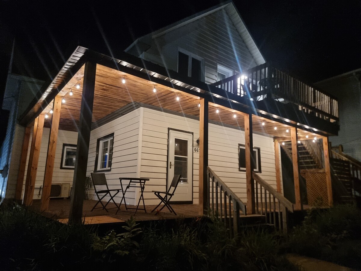 Situé au Coeur du Village de Montebello tout devant la fameuse fromagerie & marina au bord de la rivère des outaouais 🏡le 665 Logement rustique modernisé d'une ambiance Zen qui vous charmera dès votre entrée 🛏Capaciter de 2 voyageurs, d'une chambre a coucher lit queen parfait pour un couple ou ami(e) 🛁😱 Salle de Bain unique en son genre 📺 Digne d'une salle de cinema maison🎞 Profitez d'une espace de salon spacieuse, d'une télévision de 65'' et d'un sofa comfortable. Wifi, Netflix,