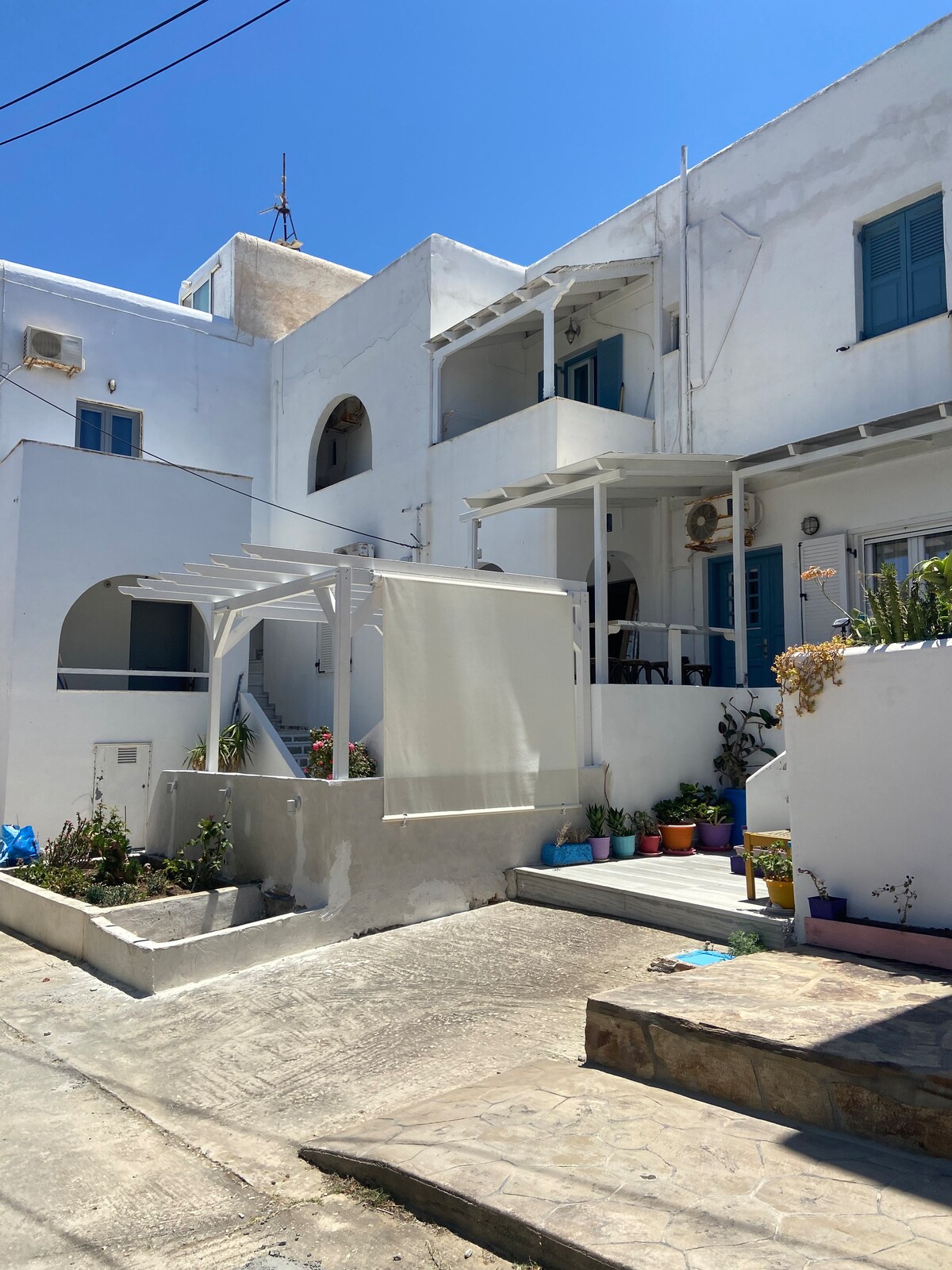 Bienvenue à Casa filareti. Profitez de votre séjour dans nos magnifiques studios au centre de Chora sur l'île d'Ios. Un lit double et un lit simple, une cuisine équipée, deux climatiseurs, une salle de bain, un balcon avec vue sur la ville. Supermarché, restaurants, bars, clubs à une minute de chez vous ! Arrêt de bus et agence de location de voitures à une minute de la chambre. Les lits intégrés et les couleurs de la mer Ég Égée vous offriront le séjour que vous recherchez ! Nous serons heureux de vous accueillir dans la belle Ios !