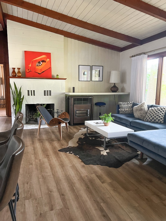 This cabin has been recently remodeled with high end furnishings and appliances in a quiet setting but close to the local amenities. Each bedroom has a California king-size bed and a Wifi connected smart TV. There is a 50" flat screen in the living room, 3 Sonos speakers to play your music and the kitchen is stocked with plenty of Williams Sonoma cookware, knives, and dishes.