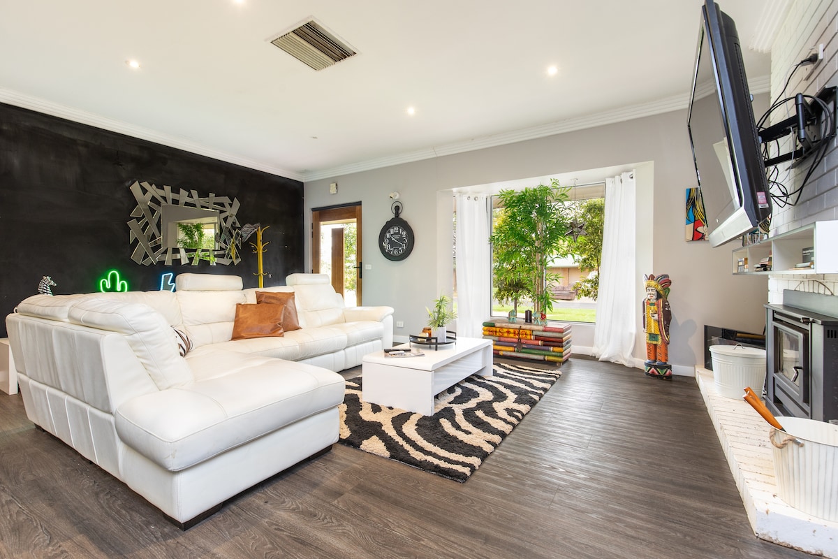 Ce logement paisible offre un séjour détente pour toute la famille à seulement 8 km du CBD de Mildura. L'escapade idéale pour une famille, des familles ou un couple. Nichée au cœur de la nature avec des vignobles à proximité, cette oasis récemment rénovée se trouve à quelques pas de la réserve faunique de Kings Billabong où vous pourrez faire de la randonnée, du vélo, du canoë, de la pêche et de l'observation des oiseaux. Le fleuve Murray est à quelques minutes en voiture, et le populaire Woodsies Gem Shop est accessible à pied.