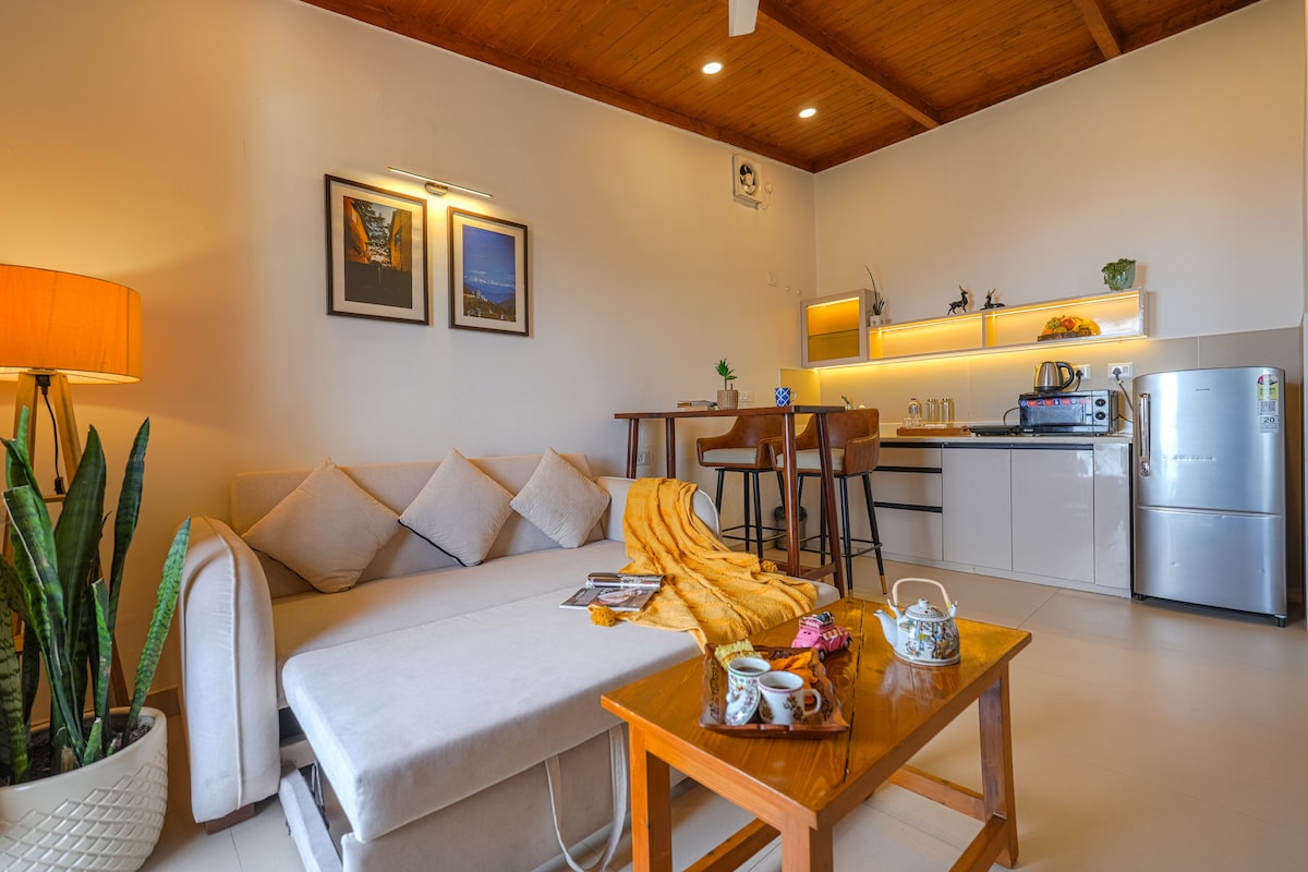A 2BHK concept with Dehradun-Mussorie valley view, kept it for Workation ready with mountain and Doon-valley view. This Dehradun Mussorie home offers quiet premium and everyday comfort. Suggested stay in Dehradun-Mussorie Premium & thoughtfully curated furnishing layout create a space that feels both refined and welcoming. We dressed up this home in trendy way, ideal for guests who value privacy, comfort, simplicity and perfection. Designed in warm beige tones with a calm, minimal aesthetic.