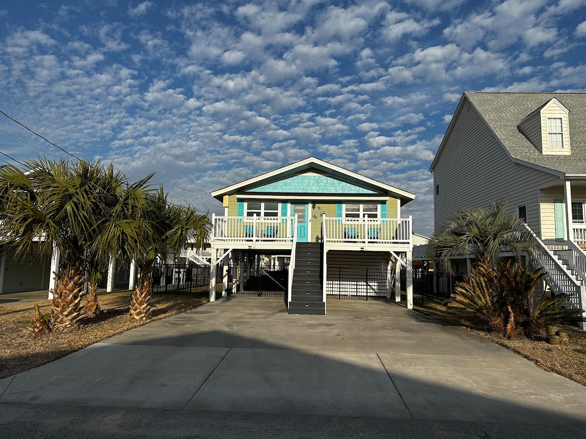 Family fun for all ages, located near the beach and intercoastal waterway. Safe central location with colorful artsy fun! New 2026 pinball. Lavish modern décor with comfortable King & Queen bedrooms. A short drive to family favorite Cherry Grove Beach. High tech sound & lighting systems, Dolby Atmos, LG OLED TVs, streaming & PS5 game system, arcade, foosball and new pinball machines. Tesla car charger. Full featured gourmet kitchen, Weber charcoal grill, and fire pit. Ready for play!