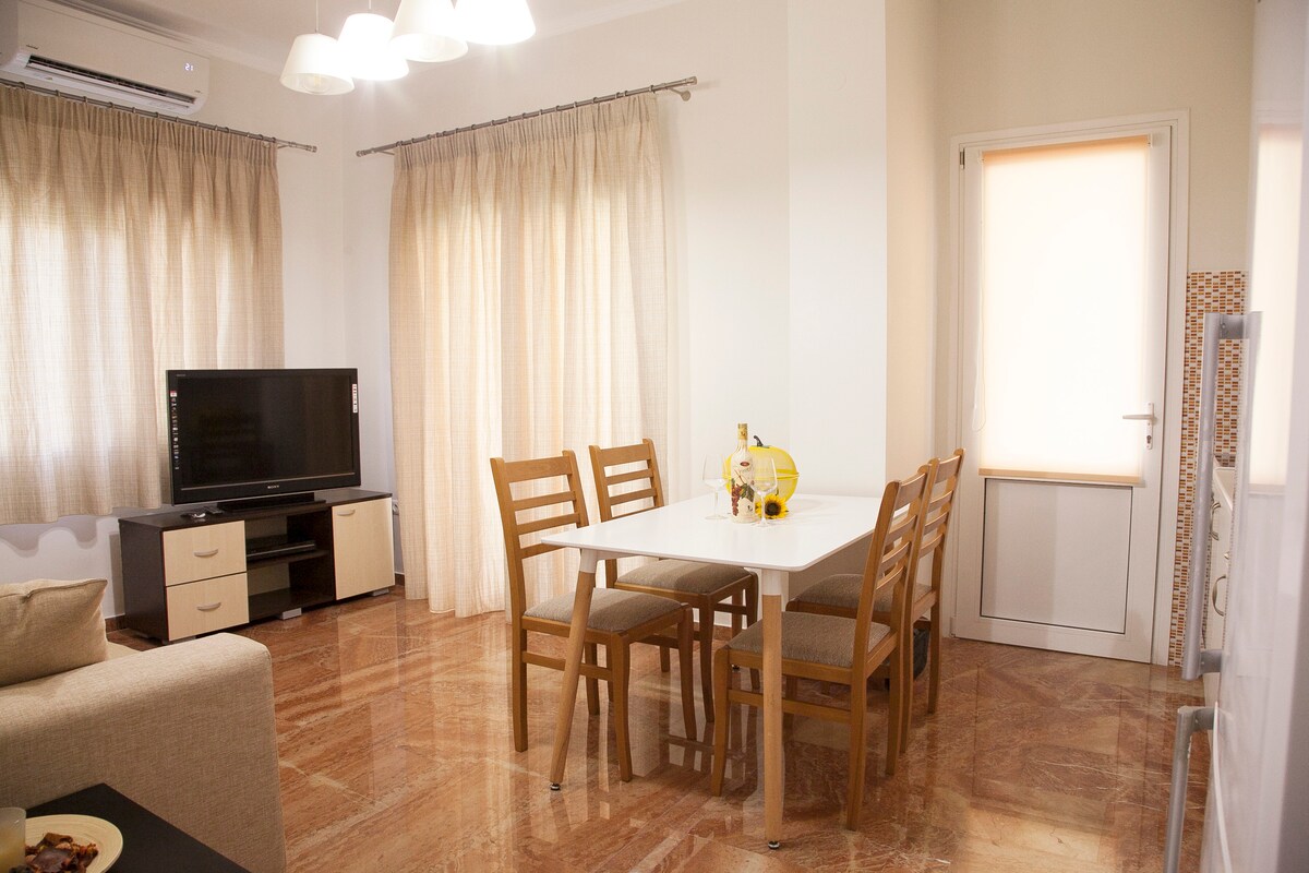 L'appartement (76m) est calme, meublé à la mode et entièrement équipé avec balcons donnant sur un jardin. Toujours propre et rempli de tout le nécessaire. Il se trouve à 10 minutes à pied de la vieille ville et à 100 mètres de l'arrêt de bus pour Athènes. Une place de parking gratuite est disponible. L'hébergement peut être fourni aux couples, aux familles, aux amis et aux voyageurs d'affaires. Notre objectif principal est de vous aider à vous sentir comme à la maison, à vous détendre et à profiter de notre magnifique ville...