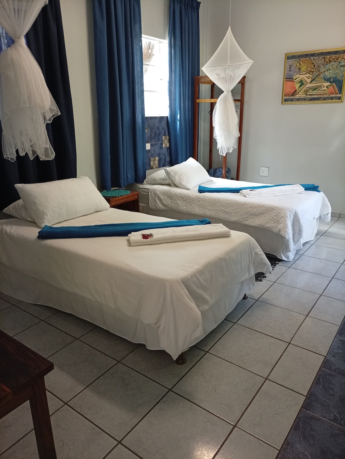 Le chalet indépendant est dans les jardins. Il dispose de deux chambres et de deux salles de bains. Une chambre dispose d'un lit double et d'une salle de bains privative et d'une chambre avec deux lits simples. Il y a un salon commun, une salle à manger et un bar dans la maison principale. Les jardins sont un havre de paix avec une piscine. Les repas sont disponibles comme ci-dessous. Dîner @R270 pp – Repas maison de 3 plats Petit déjeuner @R125 – disponible à partir de 19 h 45 Les activités sont disponibles comme décrit dans « Autres informations à noter »