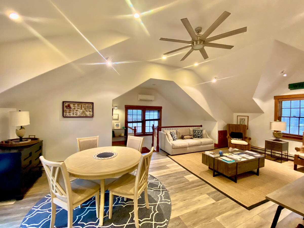 Appartement rénové, moderne et charmant dans le centre de Nantucket. 1 120 pieds carrés, peut accueillir totalement 8 personnes. Le salon dispose d'un foyer électrique confortable pour les nuits fraîches à Nantucket. Cuisine complète. Cour arrière privée luxuriante avec patio, gril, hamac et douche extérieure relaxante. Deux places de parking devant la maison. L'emplacement central est accessible à pied jusqu'au centre-ville, aux épiceries, aux cafés, aux restaurants et aux boîtes de nuit. À proximité de quelques gares routières qui vous emmènent dans toutes les parties de l'île.