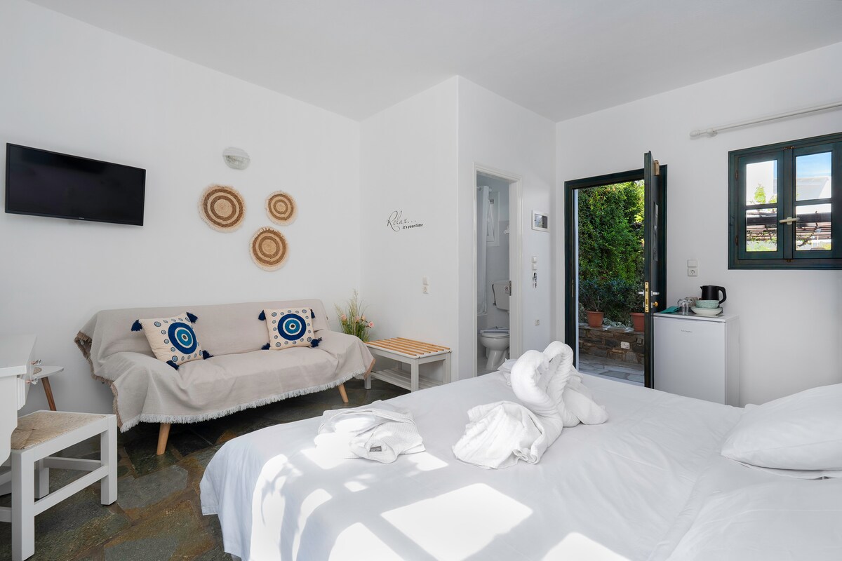 Nos chambres ont le style traditionnel des Cyclades que vous aimez. Notre entreprise est petite afin que nous puissions prendre soin de tous nos voyageurs ! Alors ne perdez pas de temps, réservez dès maintenant pour commencer vos vacances avec nous ! Nous avons réussi à faire en sorte que vos vacances vous fassent vous sentir comme chez vous !! Dans la chambre, il y a deux terrasses, une immense à l'arrière et une petite à l'entrée donnant sur notre magnifique jardin. La chambre dispose d'un réfrigérateur, d'une bouilloire et d'une machine à café Tassimo pour commencer la journée avec une bonne tasse de café !