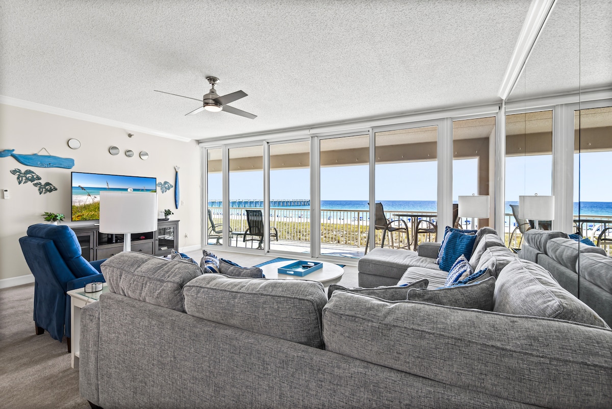 Spacious 3/3 beachfront living at Navarre Beach on The Gulf. Large panoramic windows and private circular beachfront balconies. Large open concept living area is recently remodeled and has "beachy" decor. Seating for 8. Smart tvs in living room, queen and twin rooms, with DirectTV. Tranquil, sea-side drive along uninhabited Gulf Islands National Seashore from Navarre Beach to Pensacola beach. May occasionally see the Blue Angel's or Fat Albert do a fly-by